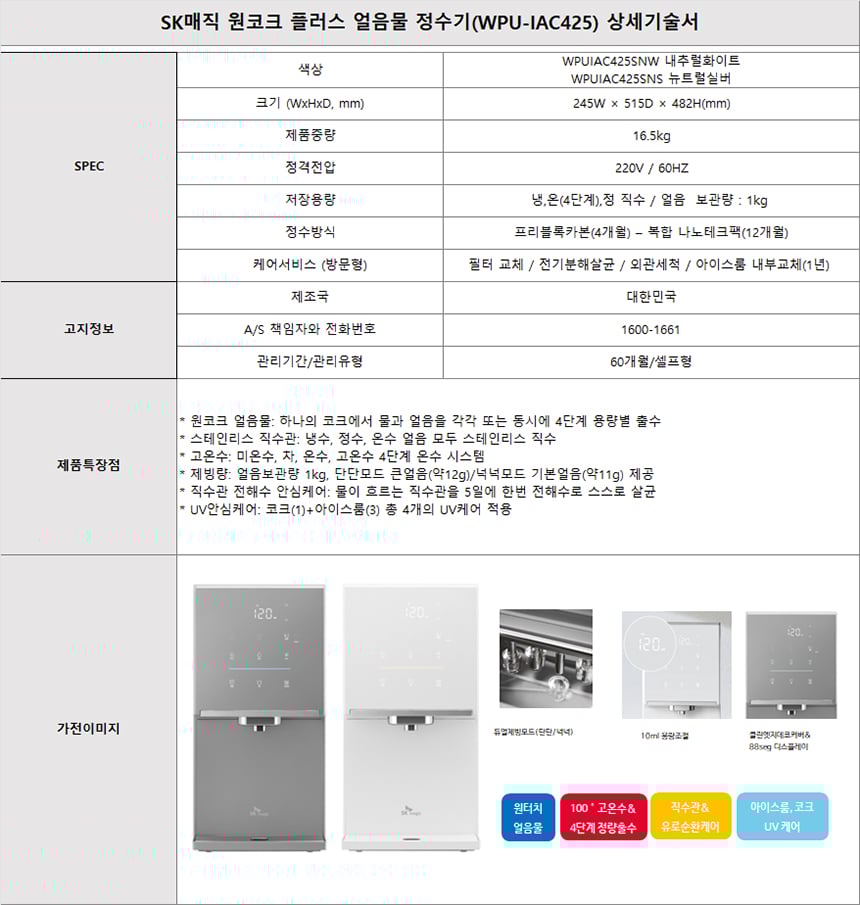 WPU-IAC425SNS+BID-S17D 소노아임레디 [SK매직] 원코크 플러스 얼음 냉온정수기 실버 + 풀스텐 살균 비데 화이트 제품분류 결합상품 구좌 4구좌 AS기간 1년 최저 렌탈가 월 66,000 (렌탈가) 제휴카드 할인가 월 (렌탈가) 1-200회 60개월 셀프관리 60개월 셀프관리 할인 제휴카드 보기 렌탈신청 장바구니
